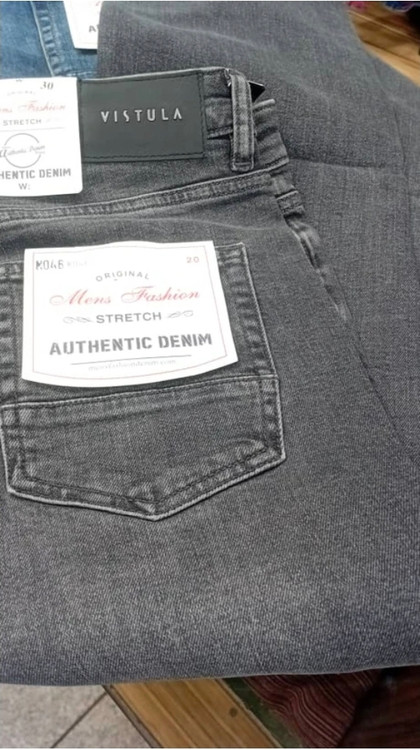 در محصولی با عنوان «Pre-owned Jeans Tapered Fit» برند Vistula آمده است که ترکیب پارچه بیرونی این جینها 77٪ پنبه (cotton)، 21٪ پلیاستر، 2٪ الاستان (elastane) است.
