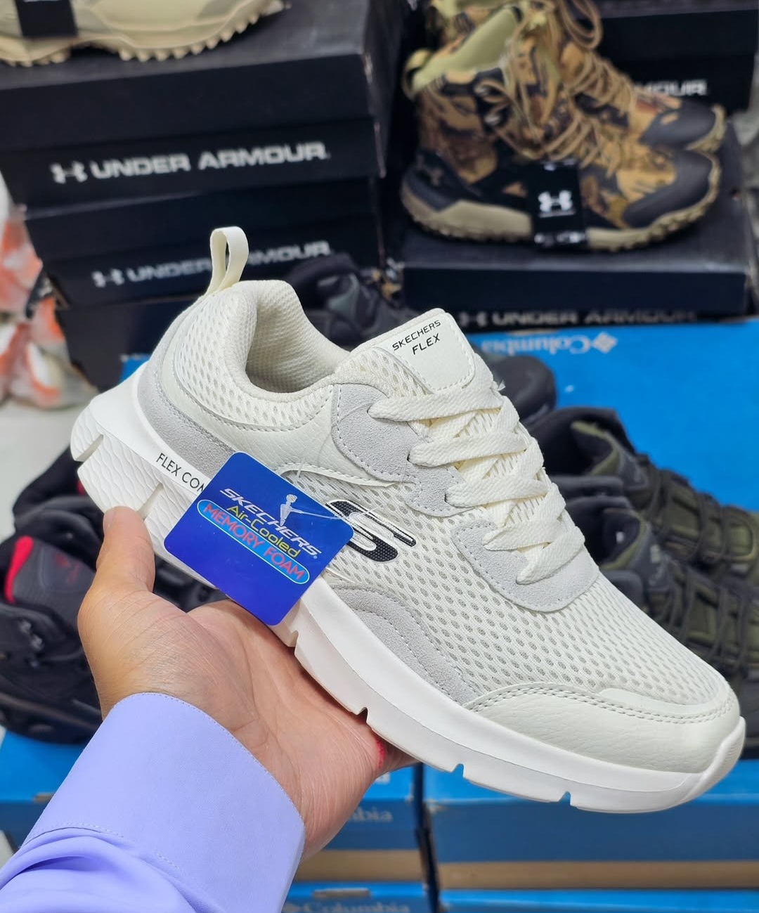 برند Skechers (اسکچرز) است و مدل آن از سریهای راحتی و روزمره این برند هست نوشتهی "FLEX COMFORT" روی لژ کفش نشاندهندهی استفاده از تکنولوژی مخصوص اسکچرز برای راحتی بیشتر پا در طول استفاده روزانه است.